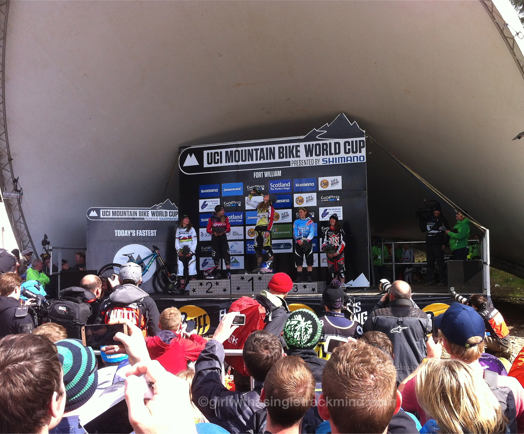 The women’s elite category was dominated by the Brits, and it was fantastic to see our girls take four out of five spots on the podium, with Rachel Atherton in first place and Tahnée Seagrave, Manon Carpenter and Katy Curd in second, fourth and fifth respectively. To be honest, I don’t know if I was more impressed by watching Rachel race, or down a whole bottle of champagne (or at least what was left of it once it had been sprayed around) on the podium, but I was stoked to get the chance to congratulate her in person, and get a cheeky fan pic!