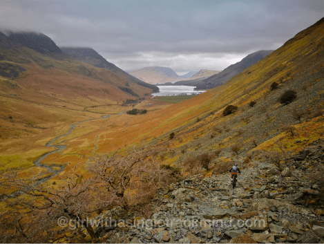 I’d heard that the Warnscale Bottom descent to Buttermere was pretty technical, so was looking forward to giving it a go. In fact, that descent was probably the main reason I was attracted to the route in the first place, and it definitely lived up to expectations. Although the very top section was fairly straightforward, it wasn’t long before we dropped onto an extremely rocky trail that clung to the steep hillside. Negotiating my way down the steep jagged slabs, precariously close to the edge, provided some butt-clenching moments, but after a while it became less twisty, and the solid rock gave way to loose boulders, presenting an altogether different challenge. Juddering down the rough terrain, trying to stay relaxed and hold it together, I felt very grateful for my bike’s suspension, without which I would surely have been bucked off, not only the bike, but the edge of the hillside. Half way down I paused to give my burning arms a rest and take in the stunning views of the valley with Buttermere sitting pretty below, before clattering my way to the bottom.
